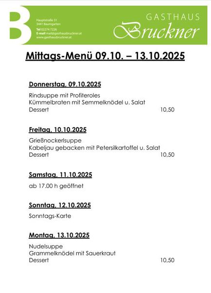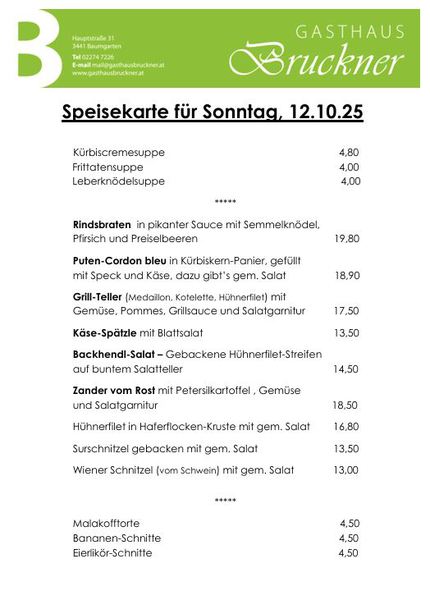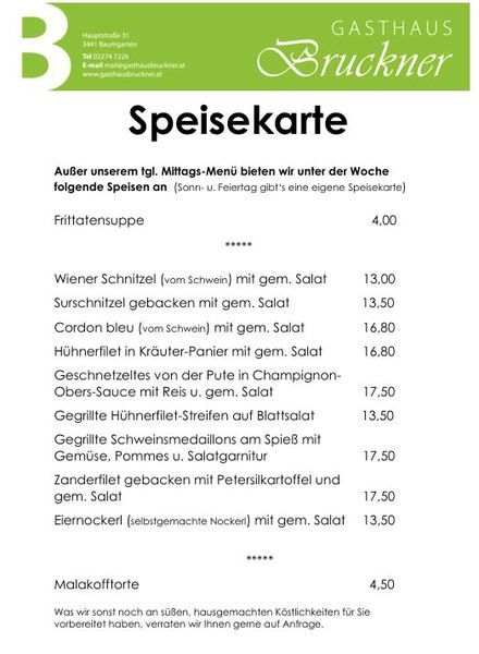 Schon seit über 100 Jahren gibt´s das Gasthaus Bruckner in Baumgarten im schönen Tullnerfeld. Wir kochen ganz traditionell - echte Hausmannskost, alles frisch und selbstgemacht.